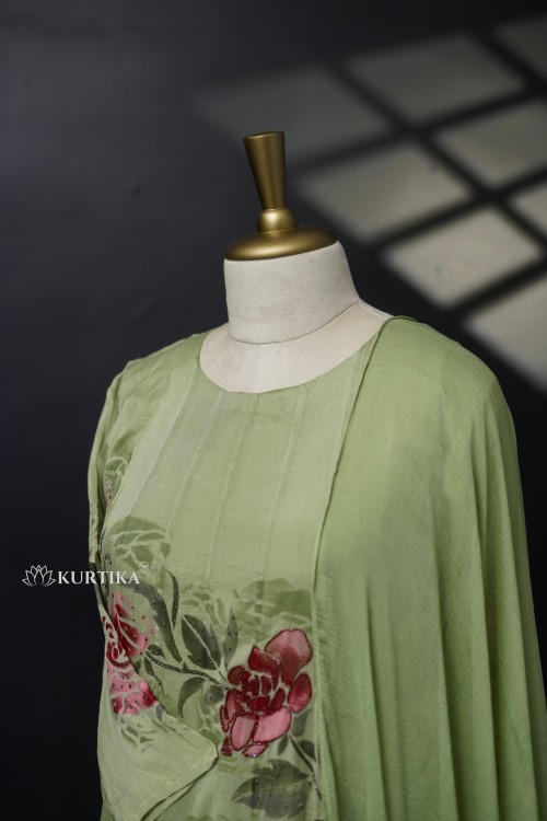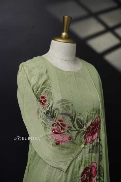 Light green pure chinon with hand?painted floral motifs and kalli flare brush?painted roses add an artisanal touch, making every piece one of a kind.