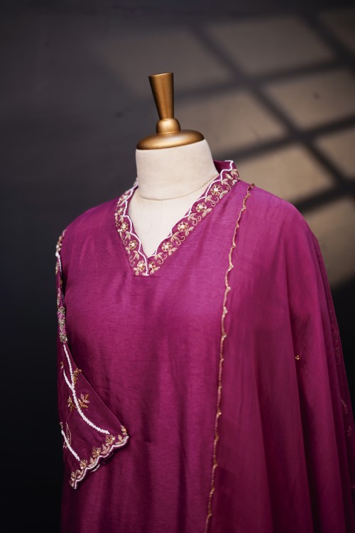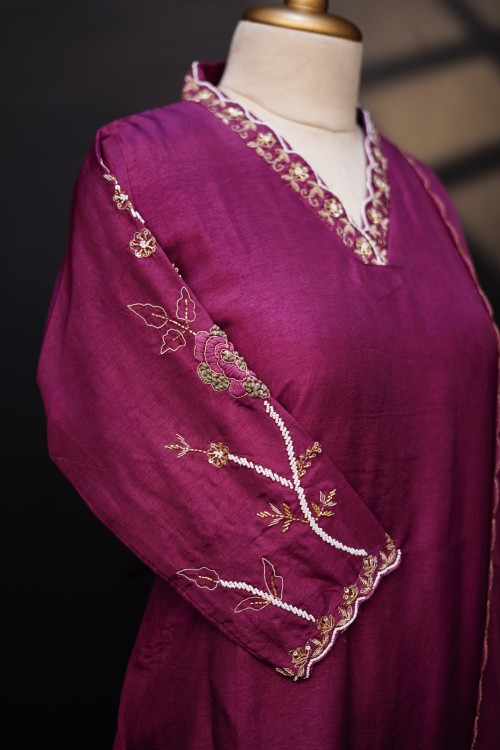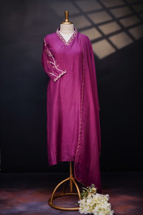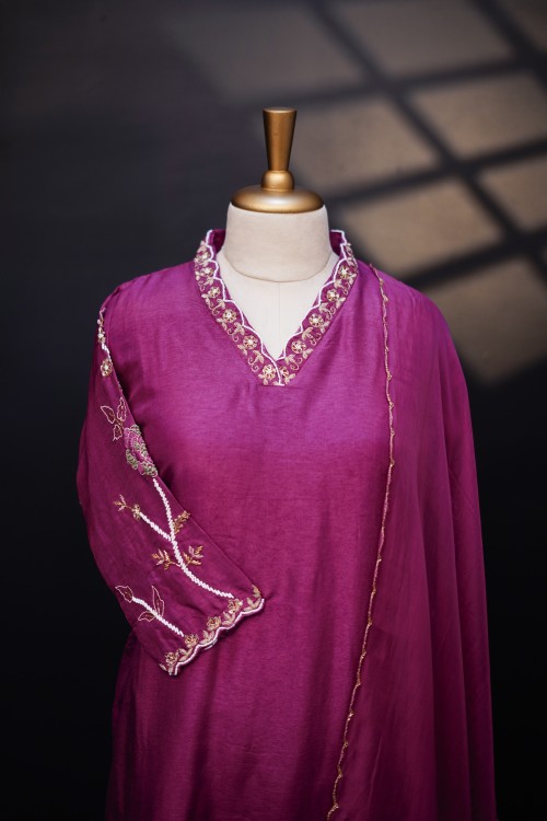 This Magenta color kurti is crafted with premium Russian silk fabric(top & bottom) that offers a lustrous and comfortable feel. The neckline showcases intricate hand embroidery with floral motifs and scalloped V-neck design is bordered with fine beading, The handwork on this sleeve is truly captivating with fine floral embroidery and dupatta is viscose organza with scalloped border that elevates the entire look of the garment perfect for festive occasions and parties.