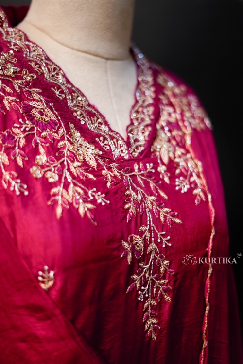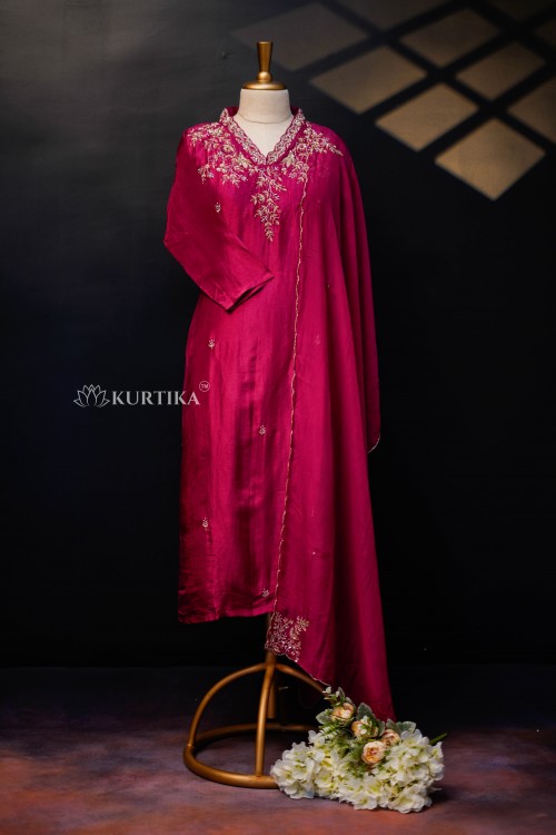 This dress is crafted from premium Russian silk fabric ( top & bottom) offering a luxurious and soft feel. It features a stunning magenta base adorned with intricate gold and silver thread embroidery that highlights the neckline and yoke region as well and duppata is a viscose organza with embroidery accents run along the border giving it an elegant look. This outfit is perfect for festive events, weddings, and celebrations offering both comfort and elegance.