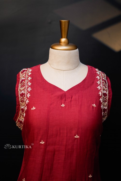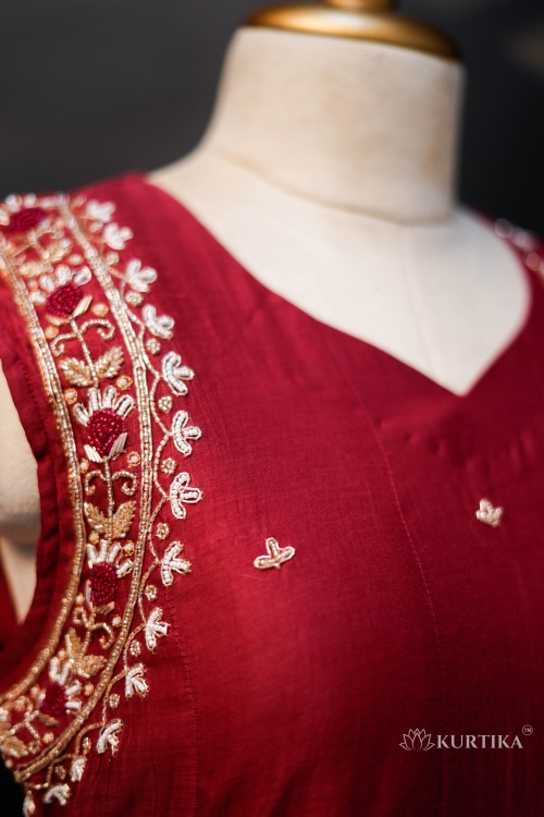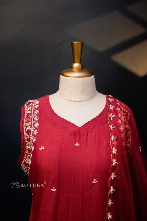 This elegant dress comes in a rich rust colour and is crafted from mul Chanderi fabric ( top & bottom ), highlighted with delicate embroidery. Paired with a sheer organza dupatta, it brings a festive yet refined look. Sleeves are provided inside the dress and can be attached as per preference.