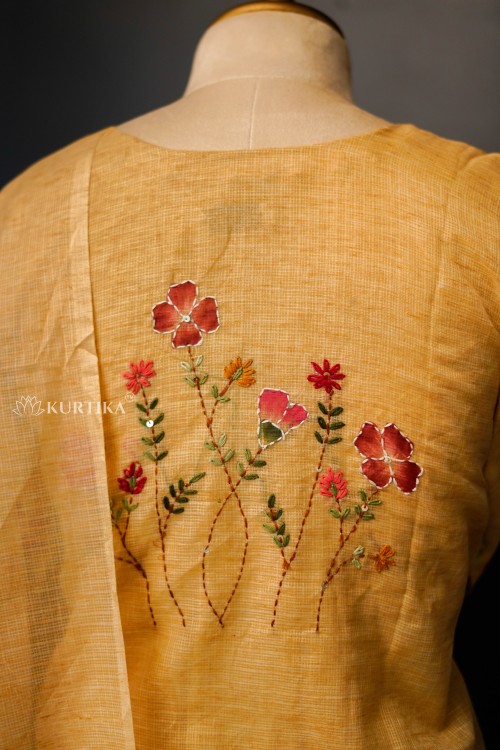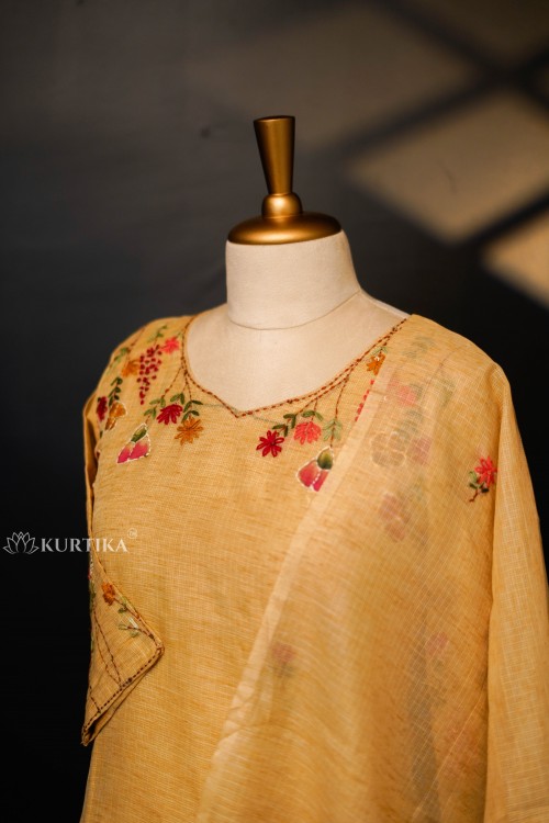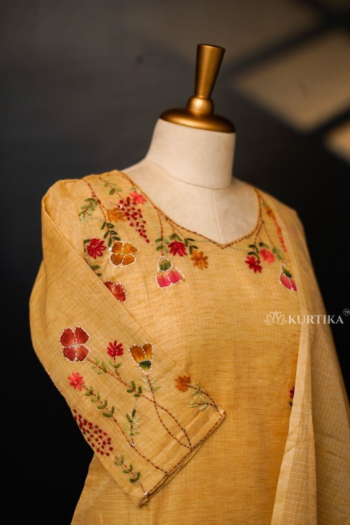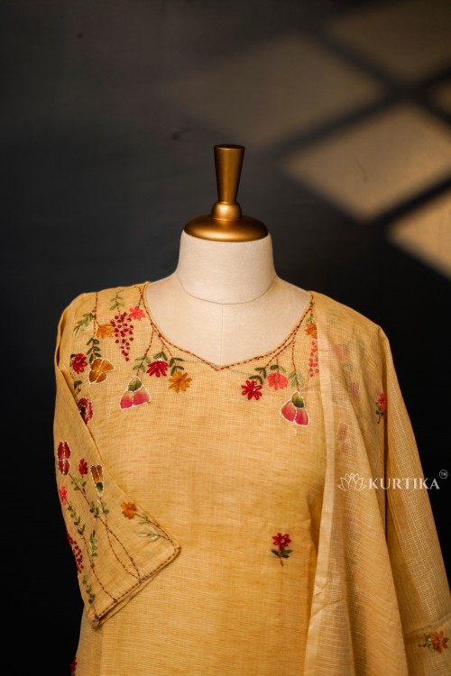 This cotton Kota doria fabric ( top ) and santoon ( bottom ) set in a cream shade with colorful hand-painted flowers and leaves, along with fine Kantha stitch embroidery.The dupatta edges feature artistic floral designs, making the set graceful and visually appealing.The focus is on the neckline and sleeve, highlighting the vivid floral and leaf pattern giving the piece a refined and elegant look.This design is perfect for special occasions, office wear, or casual events, offering both sophistication and comfort.