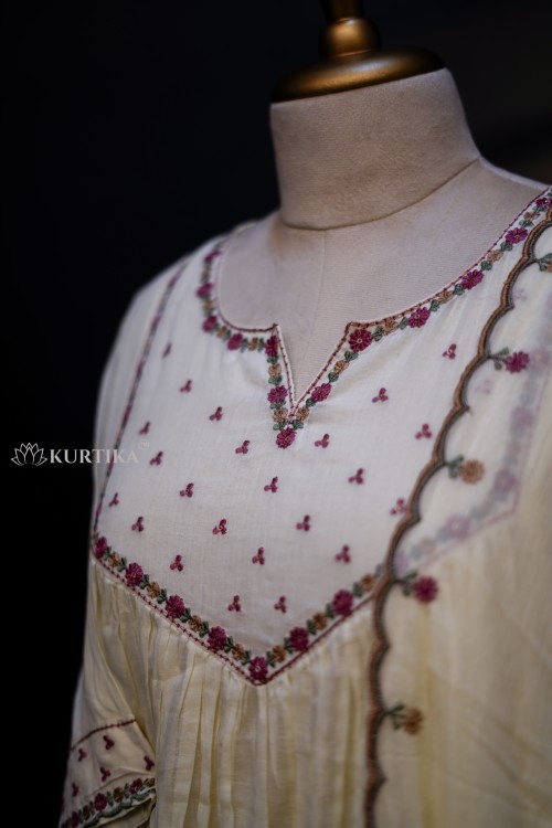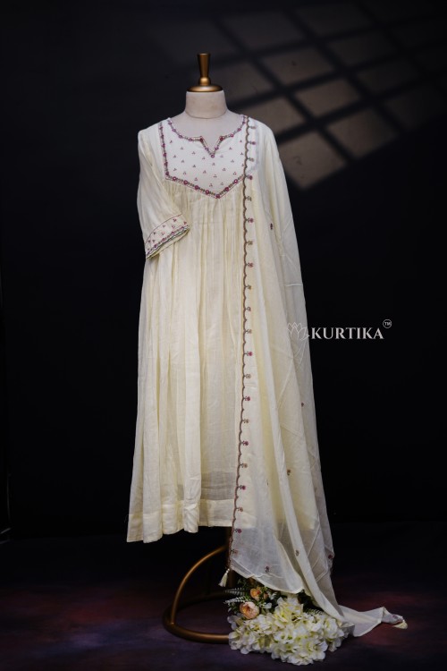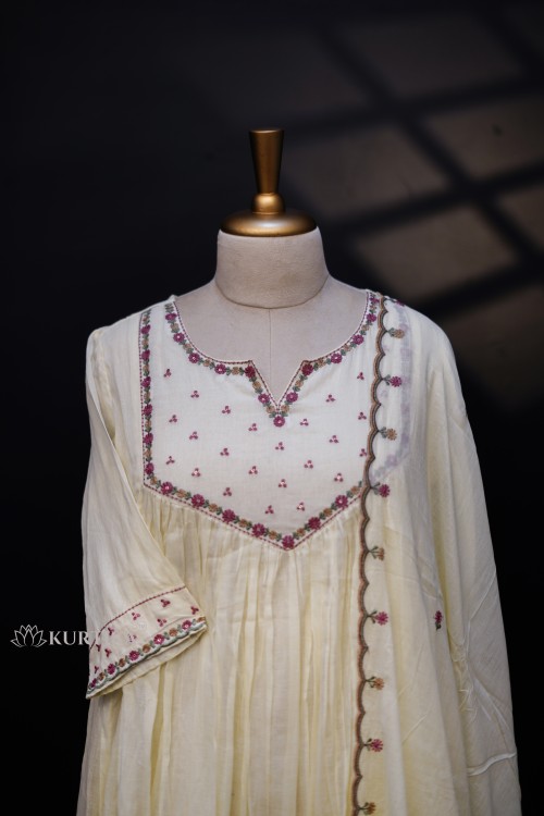 This beautiful dress is crafted from premium mul cotton fabric(top& bottom) ensuring a light, airy and exceptionally soft feel that's perfect for all-day comfort. Presented in an elegant off-white or pastel lemon hue, the kurti features intricate mission embroidery along the neckline and bordered with thread work forming charming floral motifs, the graceful simplicity of the piece with its gathered and dupatta scalloped with thread work, this kurti is ideal for outings, casual events, or relaxed celebrations.